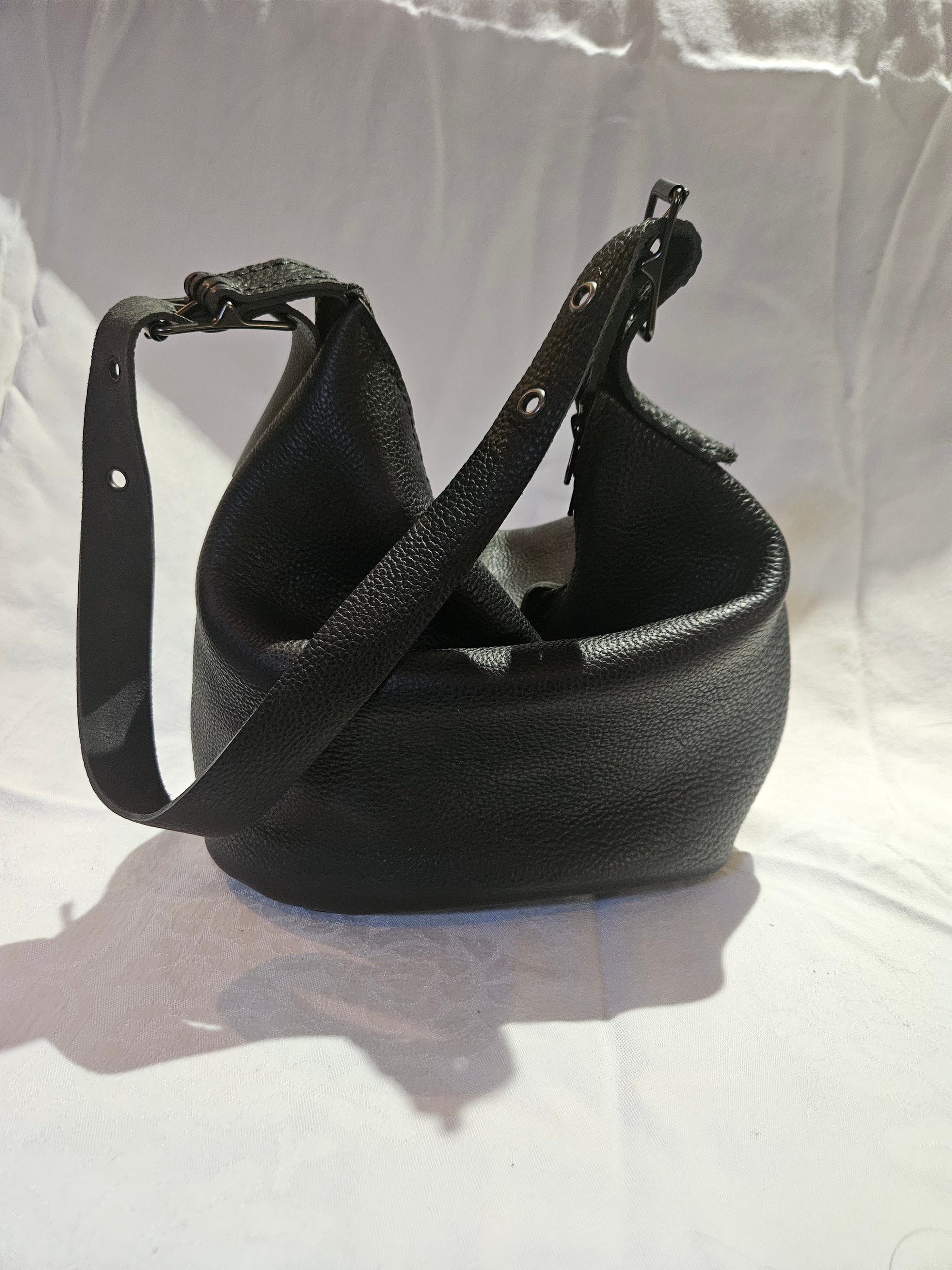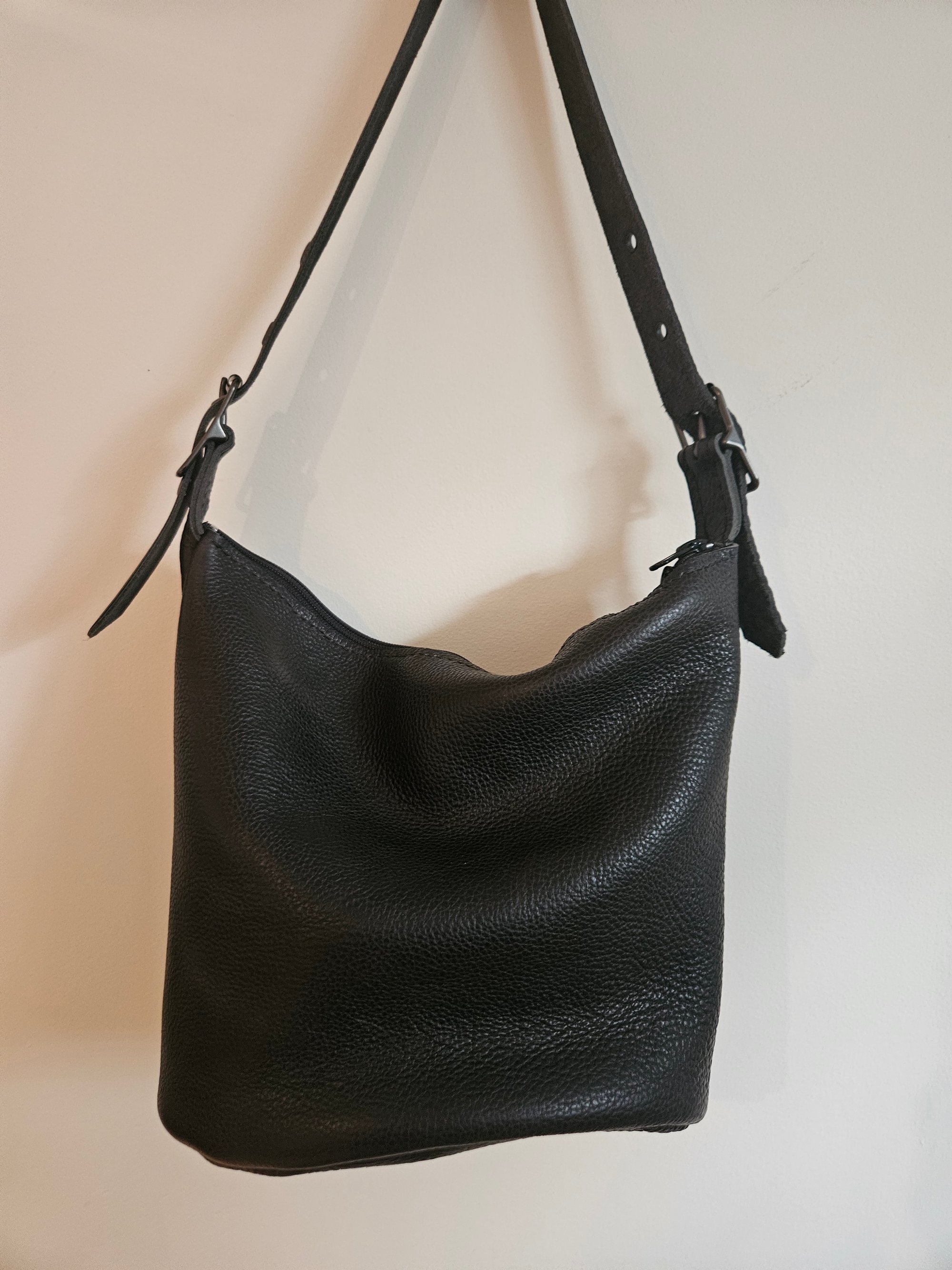 Utilized an exclusive one of a kind side of pebbled full grain cow leather tanned in Argentina. Lends this unique bag a sturdy yet flexible durable motorcycle cool girl feel.